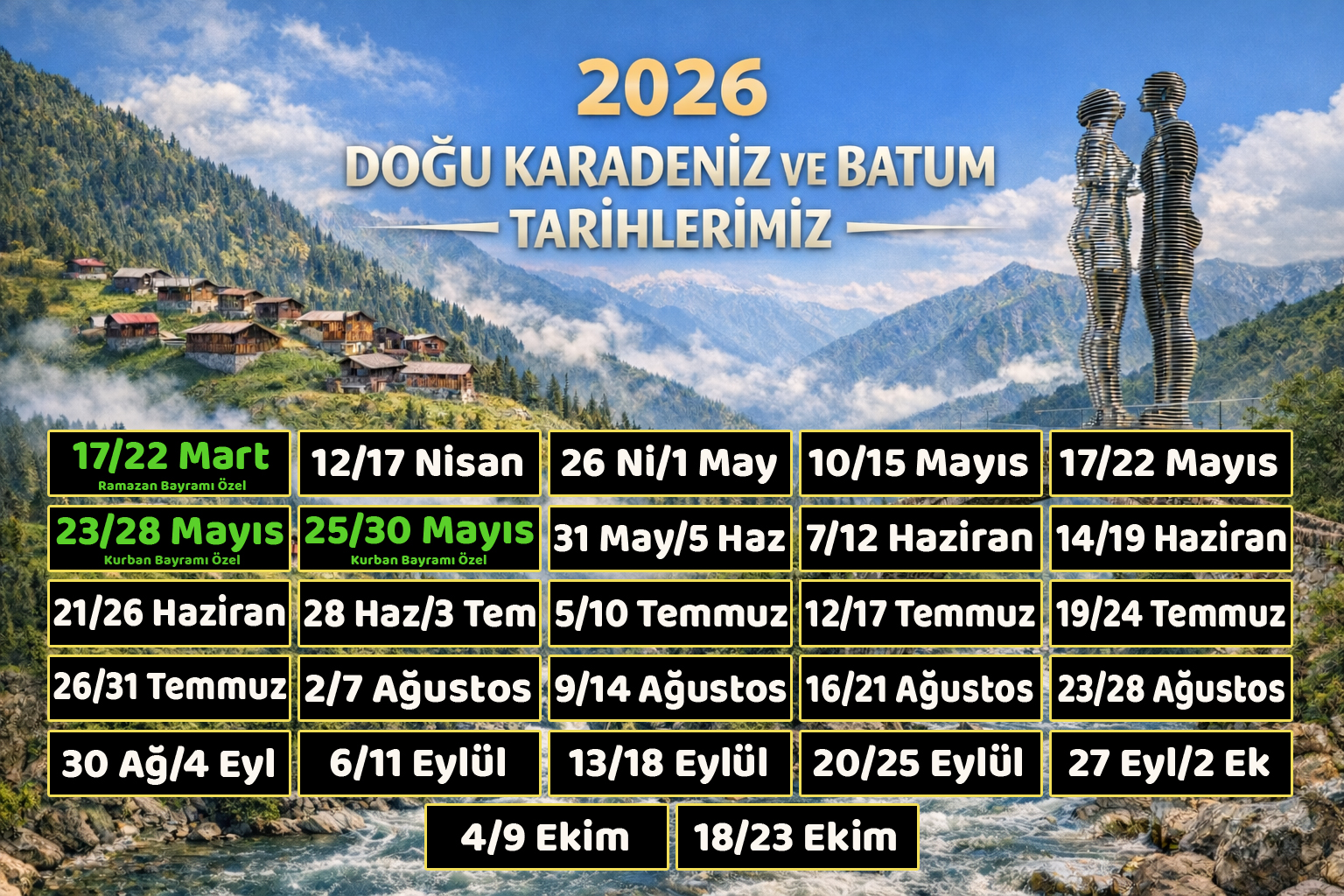 Sümela Manastırı- Sürmene Bıçak Fabrikası- Ayder Yaylası- Huser Yaylası(opsiyonel)- Zilkale - Palovit Şelalesi - Çinçiva Köyü - Tarihi Taş Köprü - Çat Vadisi - Fırtına Deresi - Elevit Yaylası - Rafting - Zip Line – Salıncak - Batum- Tarihi Orta Camii - Aziz Nikolas kilisesi - Posedion Anıtı - Tiyatro Binası - Medea heykeli - Ali ve Nino Heykeli - Alfabe Kulesi - Meşhur Dönme Dolabı-Batum- Uzungöl- Çay Fabrikası – Yöresel Ürünler Mağazası– Ayasofya-Giresun Kalesi- Fındık Alışverişi- Boztepe - Teleferik - Ters Ev - Bandırma Gemisi - Gazi Müzesi - Onur Anıtı- Yabancılar Çarşısı